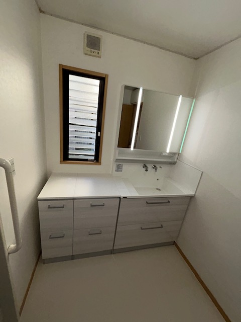 久留米市F様邸 お客様より「洗面台が古くなってきたので新しくしたい」とのご相談をいただきました。 Before 施工中 既存の洗面台を撤去し、給排水の位置を確認し、新しくやり替えました。また、床のクッションフロアを新しく張り替えます。 内装を整えてから新しい洗面台を設置することで、よりきれいに仕上がります。 After 新しく設置したのはクリナップの「S」です。 すっきりとしたデザインで、お手入れのしやすい洗面化粧台です。 今回は洗面化粧台に加え、サイドキャビネットも組み合わせました。 これまで別の収納棚に入れておいたタオルや洗剤のストック、細かな日用品までまとめて収納できるようになり、収納力が大幅にアップしました。 毎日使う場所だからこそ、収納力を高めることで使い勝手が大きく変わります。 見た目も統一感があり、機能性とデザイン性を兼ね備えた洗面空間に仕上がりました。 お客様にも大変お喜びいただきました。