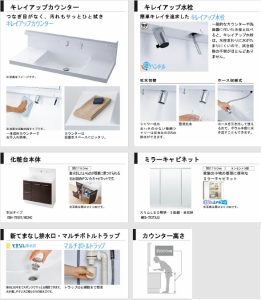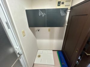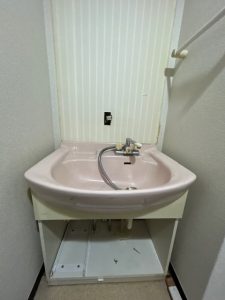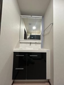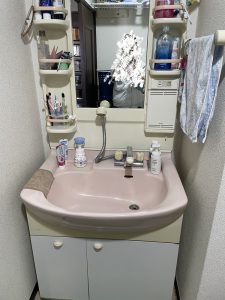 洗面所も老朽化しており、洗面台及壁クロス貼り替え・床下地補強クッションフロア張替えにて改装させて頂きました。