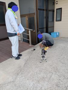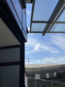 建物ギリギリのところで屋根を調整しながら設置。これからは雨の日も車からの乗り降りが安心です。