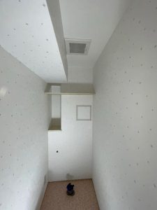 トイレ本体を外した後、壁・天井のクロス、床のCFを張り替えていきます。
