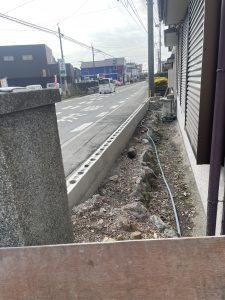 ①道路側のブロック上部解体による減段後フェンス取付