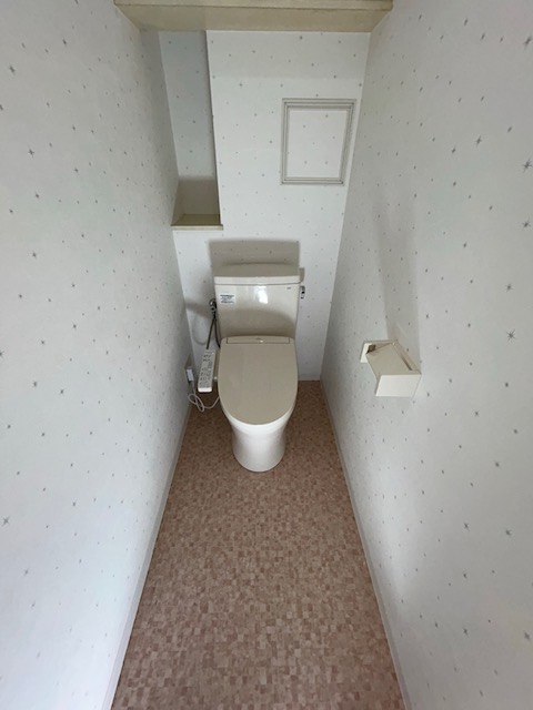 久留米市 Nマンション U様邸 Before トイレは長年使用されており、内装のクロスや床のクッションフロアにも経年劣化が見られました。 また、換気扇も古く、作動音が大きくなっている状態でした。 施工中 まずは既存の便器を撤去します。 トイレ本体を外した後、壁・天井のクロス、床のCFを張り替えていきます。 内装を新しくすることで、空間全体が明るい印象になりました。 換気扇も新しいものへ交換。静音タイプになり、換気効率も向上しました。 After 新しいトイレを設置し、工事完了です。 クロスとCFを張り替えたことで、トイレ本体だけでなく空間全体がリフレッシュされました。 清潔感のある明るいトイレに仕上がっています。 トイレ交換の際は、クロスや床も同時に張り替えることで、より一体感のある仕上がりになります。 当社はマンションのトイレリフォームも多数実績がございます。お気軽にご相談ください。